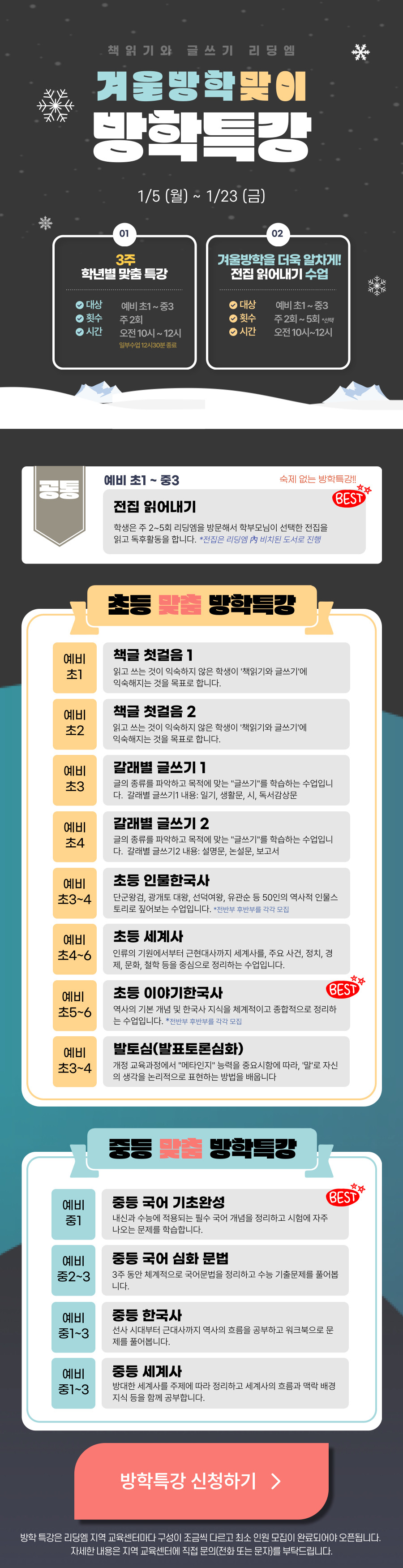 25년 <책읽기와 글쓰기 리딩엠> 겨울 방학특강 안내