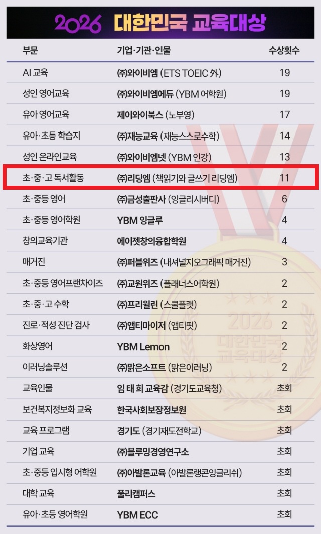 리딩엠, ‘2026 대한민국 교육대상’ 초·중·고 독서활동 부문 수상